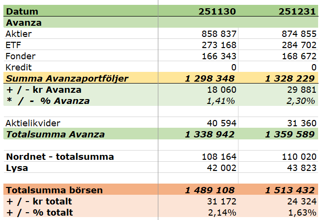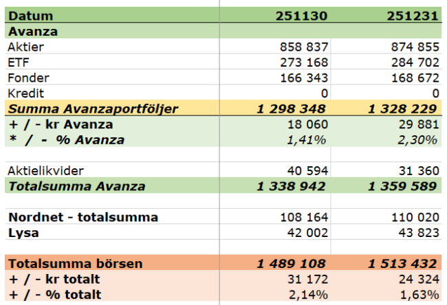 Året har varit växlande, men portföljen har tuggat på, främst tack vare insättningar från arvet jag fick i slutet på 2024.