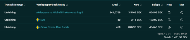 Under året har jag inte gjort några större förändringar i innehaven, förutom att jag har byggt på i mina ETF och utdelande fonder. (köpte Montrose dec 2024, så jag redovisar bara summan 20251231)